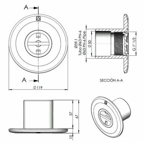 Extérieur : Ø 59,1 mm à coller sur presse-étoupes 15661/15660 ou sur tube Ø 63 mm (PN-6)