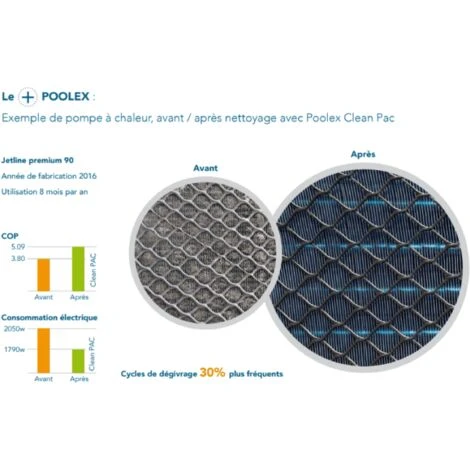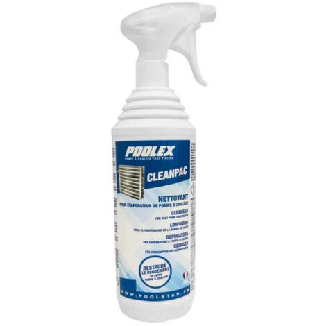 Poolex CleanPac est un nettoyant spécialement adapté à l’évaporateur de votre pompe à chaleur de piscine. Au fil du temps, l’évaporateur de la PAC s’encrasse (poussière, matière organique, …) et nécessite un nettoyage pour garantir les meilleures performances de chauffage.Bouteille de 1 L avec spray réglable et tête flexibleRestaure le rendement de votre pompe à chaleurEfficace en quelques minutes seulementUtilisation facile sans rinçage, non acideNettoie les poussières et les dépôts de graisseAgents de surface amphotères < 5% ; Agents de surface non ioniques < 5% ; Agents conservateurs : Methylisoazolinone, Methylchloroisothiazoninone