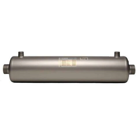 Échangeur de chaleur eau/eau, traité avec la finition et le soin habituels de grande qualité, soudé par des spécialistes. Échangeur de chaleur haut de gamme d’une résistance à la corrosion illimitée, même avec une concentration en sel élevée dans une eau de baignoire et donc résistant à l’eau de mer. Ces échangeurs de chaleur offrent un rendement énergétique maximal et des pertes de pression minimales. Comme tous les échangeurs de chaleur à serpentins tubulaires, il doit être intégré au circuit d’eau du bain directement ou dans un système bypass.
