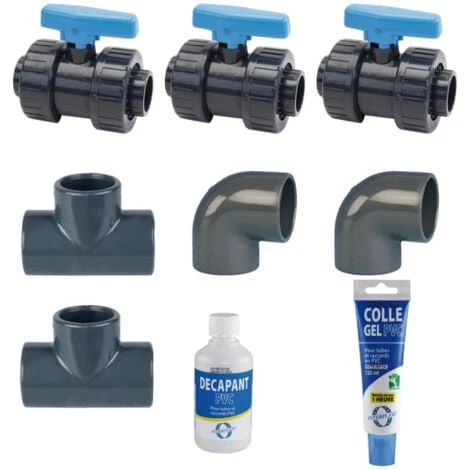 Le Kit By Pass Ø 50mm pour piscine se compose de 3 vannes, 2 coudes, 2 tés, un tube de colle PVC et 1 tube de décapant. Il permet de monter une dérivation hydraulique sur la tuyauterie de la piscine afin d’installer une pompe à chaleur ou un électrolyseur par exemple.L’installation d’un équipement sur une dérivation hydraulique (via le kit by pass) permet de régler le débit d’eau qui alimente l’équipement en question. De plus, le kit by pass permet d’isoler le matériel du circuit d’eau en cas de besoin, en fermant simplement les vannes d’entrée et de sortie.
