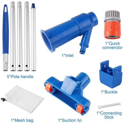 【PACKAGE COMPRENANT】1 * embout d’aspiration, 1 * sac en filet, 1 * connecteur rapide, 1 * boucle, 5 * poignée de poteau, 1 * Entrée. Aspirateur de piscine léger et portable, facile à transporter et simple à concevoir, offrant beaucoup de confort pour votre vie !