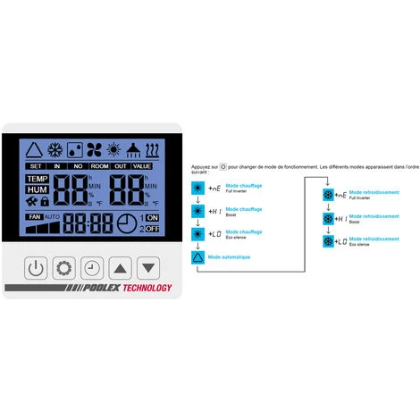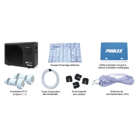 Pompe à Chaleur Piscine Poolex Jetblack Full Inverter Wifi 7kW pour piscines jusqu’à 45 m³. Haute performance, Silencieuse, compatible avec électrolyseur au sel, Design moderne, Utilisation simple et intuitive. Pilotable à distance grâce au Wifi intégré. Modes de fonctionnement : Auto – Boost – Economique – Chauffage – Refroidissement. Panneau de contrôle Digital LCD. Accessoires inclus: Manuel d’installation multi langues, 2 connecteurs PVC (Ø50mm 1½), câble de 10m pour extension filaire, Tuyau d’évacuation des condensats, Housse d’hivernage, 4 Patins anti-vibrations (visserie non fournie). Pompe à Chaleur garantie 2 ans – La pompe à Chaleur Piscine Poolex Jetblack Full Inverter Wifi 7kW est idéale pour les bassins jusqu’à 45 m³ – Haute performance, Silencieuse, compatible avec électrolyseur au sel, Design moderne, Utilisation simple et intuitive – Pilotable à distance grâce au Wifi intégré. Modes de fonctionnement : Auto – Boost – Economique – Chauffage – Refroidissement. Panneau de contrôle Digital LCD – Accessoires inclus: Manuel d’installation multi langues, 2 connecteurs PVC (Ø50mm 1½), câble de 10m pour extension filaire, Tuyau d’évacuation des condensats, Housse d’hivernage, 4 Patins anti-vibrations (visserie non fournie)