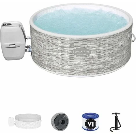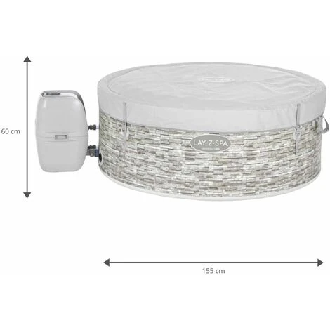 Le Lay-Z-Spa Vancouver AirJet offre une expĂ©rience de massage relaxante pour un maximum de 5 personnes. Comporte 140 sorties qui libèrent des bulles au fond et sur les cĂ´tĂ©s du spa pour que vous puissiez vous dĂ©tendre et passer un bon moment. Il est construit avec un matĂ©riau durable Duraplus. La fonction de chauffage automatique Freeze Shield incluse empĂŞche les composants internes, tels que la pompe et le revĂŞtement, de geler pendant les tempĂ©ratures les plus froides. ÉquipĂ© d’un Ă©purateur/pompe de 1 325 L/H qui gonfle rapidement le spa (le chauffe jusqu’Ă un maximum de 40ÂşC), d’un porte-boissons, d’un distributeur ChemConnect qui maintient l’eau propre en dispersant la bonne quantitĂ© de chlore.nnCaractĂ©ristiques :n- Couleur : Imitation pierre grise.n- Pour 3 Ă 5 personnes.n- Utilisation Ă l’intĂ©rieur ou Ă l’extĂ©rieur.n- Facile Ă installer.n- Forme : ronde.n- Dimensions gonflĂ©es : 155×60 cm.n- CapacitĂ© : 804 litres.n- Poids plein : 831 kg.n- Panneau de contrĂ´le numĂ©rique compatible avec l’application Bestway Smart Hubn- Épurateur: 1.325 L/H.n- Système AirJet : 140 sorties qui libèrent des bulles d’air.n- Minuterie d’Ă©conomie d’Ă©nergie.n- Filtre Ă cartouche de type VI.n- Distributeur de produits chimiques.n- Bâche.n- Patch de rĂ©paration.