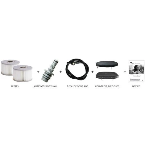 - Accessoires fournis : Cartouche filtrante x2, tuyau de gonflage avec manomètre, adaptateur de tuyau de drainage, couvercle.